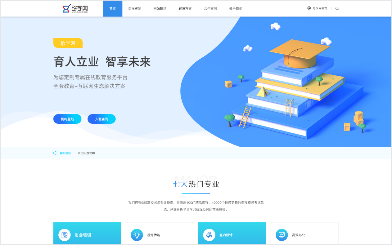 珍学网在线网校,基于电脑端游览器器,以轻量化的形式,实现在线网络学习平台。入驻机构拥有独立域名,个性官网,学习中心可为学员提供沉浸式课堂学习体验。